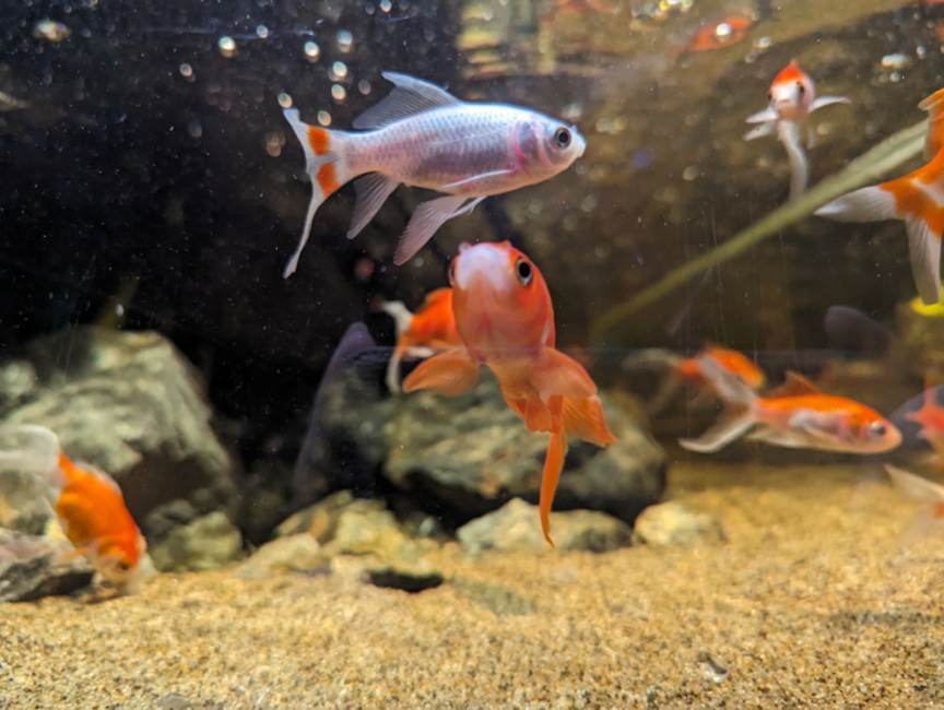 約3,000匹の金魚が泳ぐ水槽に、プロジェクションマッピングや光の演出を組み合わせたアート空間です。色とりどりの金魚が光に照らされてゆらめく様子は、まるで水中の万華鏡をのぞいているかのよう。暗い空間に映える鮮やかな展示は、小さなお子さんの好奇心を強く刺激します。