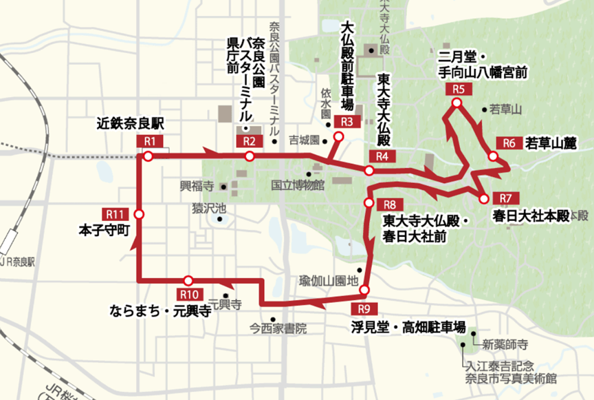 奈良公園ルートはJR奈良駅から出発し、奈良公園内の各スポットを巡回します。大宮通りルートは、大和西大寺駅から平城宮跡を経由してJR奈良駅方面に向かうルートです。平城宮跡へのアクセスには、この大宮通りルートが特に便利です。
